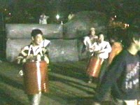 | 火矢によって点火された炎のまわりをドラム缶太鼓がねり歩き・・・ |