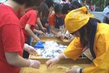 | 餅つきを甘く考えていました。あまり人員を入れていなかったため、担当者は餅つきに係り切りになってしまい、ゾーンから「はずれた」感じになっていたりしました。1日に2千人分の餅を配るという計算も出来ておらず、その半分で試算していたので、色々な物が1日で足りなくなり、当日に買いに走ったりする事になってしまいました。「もう嫌、餅つきしたくないー」と思いながらも、みんなで頑張って30臼つきました。 |