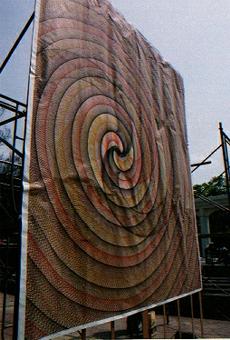 | 南畑智美 布地に我流で染める事を知り、それを利用してブロークンパッチワークをはじめるが、現在「土」「木」など素材を問わず表現することを目指している、が、たこやき屋の看板娘!?でもある。 表現の仕方が違うようにみえて、どこか表面下でつながっているところがあるのをみていただきたいです。 |