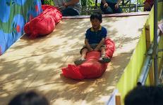 自由に遊べるすべり台、スポンジのソリですべりおりよう。