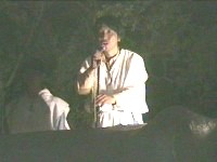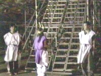 | 石舞台が割れ、中から女王様が登場、神殿へと登ります。 |