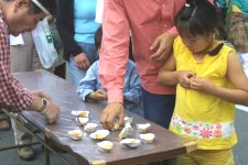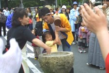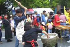 | 餅つきを甘く考えていました。あまり人員を入れていなかったため、担当者は餅つきに係り切りになってしまい、ゾーンから「はずれた」感じになっていたりしました。1日に2千人分の餅を配るという計算も出来ておらず、その半分で試算していたので、色々な物が1日で足りなくなり、当日に買いに走ったりする事になってしまいました。「もう嫌、餅つきしたくないー」と思いながらも、みんなで頑張って30臼つきました。 |