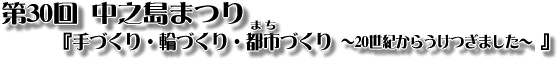 第1回は昭和48年5月5日に開かれた。中之島の景観保存から、このまつりは生まれた。それから30年、今年は「手づくり・輪づくり・都市づくり〜20世紀からうけつぎました〜」をテーマとした。どうぞ、楽しんでください。