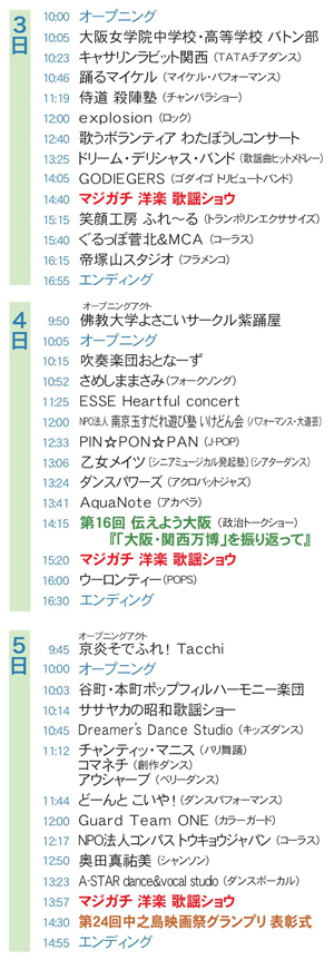 | ■メインステージ 歌、演奏、踊り、大道芸、殺陣ショーなど、バラエティあふれる様々な“えんた~てぃな~”が大集合。 ■第16回伝えよう大阪【5月4日】 “議員を身近に、政治に関心を”テーマに掲げる「伝えよう大阪」 今回は『「大阪・関西万博」を振り返って 』 と題してトークします。 ■マジガチ 洋楽 歌謡ショウ【5月3日、4日、5日】 恒例の歌謡ショウ。今回のテーマは「洋楽」です! |